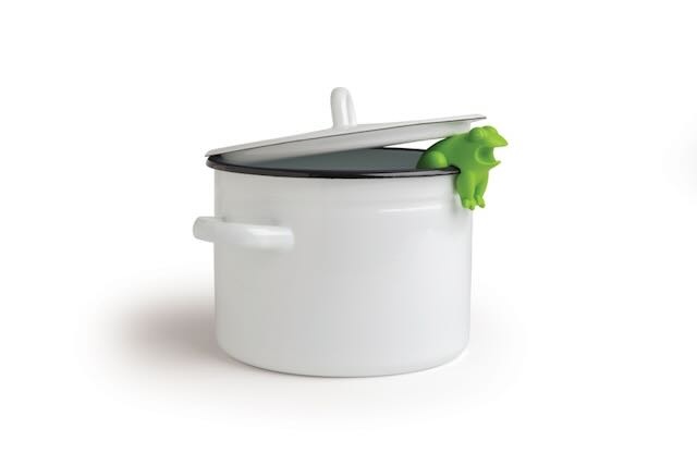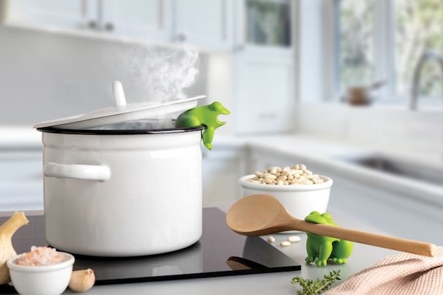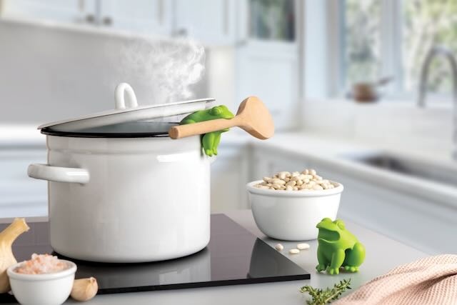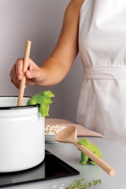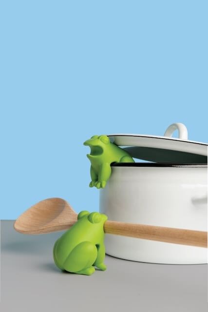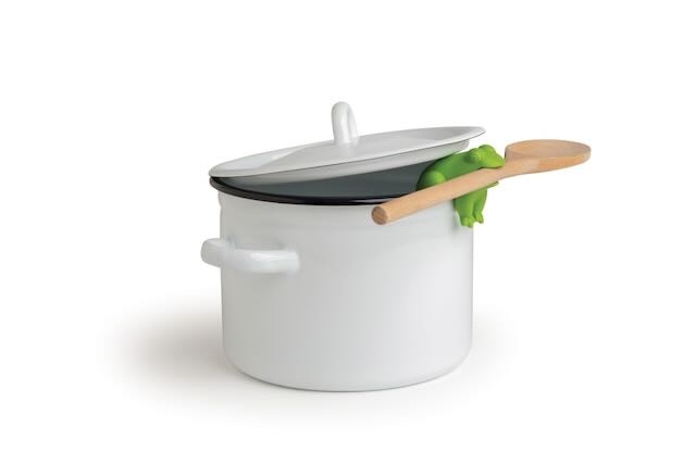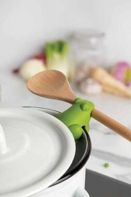 Met de HopTop lepelhouder van Ototo kun jij voortaan met een gerust hart koken. Deze handige kikker houdt je lepel stevig vast in zijn bekje, zodat je de vieze lepel niet op het aanrecht hoeft te leggen. Bovendien helpt HopTop met het aflaten van stoom door op de rand van je pan te zitten. De slimme kikker houdt de deksel iets omhoog, waardoor je je geen zorgen meer hoeft te maken over overkokende pannen. 100% voedselveilig en vaatwasmachine bestendig. Afmetingen 5,5 x 5,5 x 5,5 cm