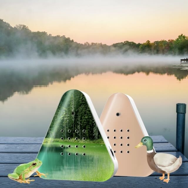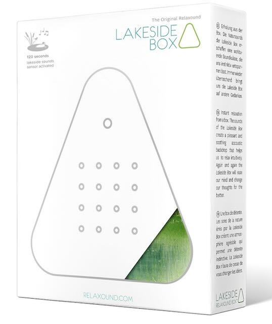 Lakesidebox van Relaxound is uitgerust met een bewegingssensor. Zodra je beweegt in de buurt van de Lakesidebox, hoor je 120 seconden het geluid van een idyllisch bosmeer in de zomer: opspattend water, kwetterende vogels, kwakende eenden en tsjilpende krekels.