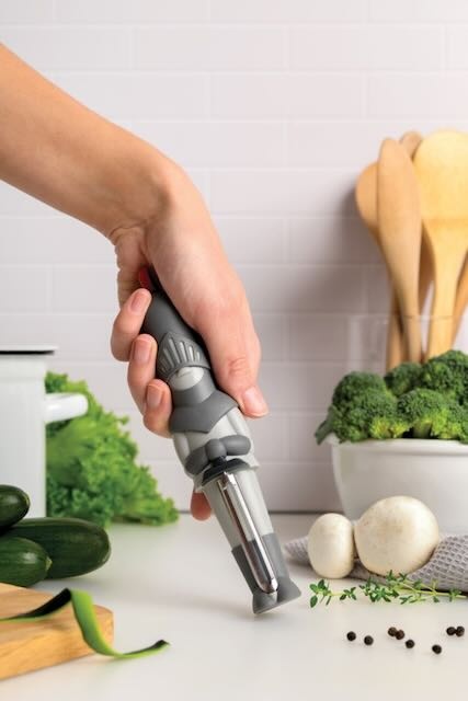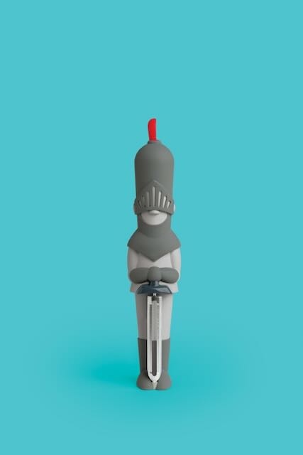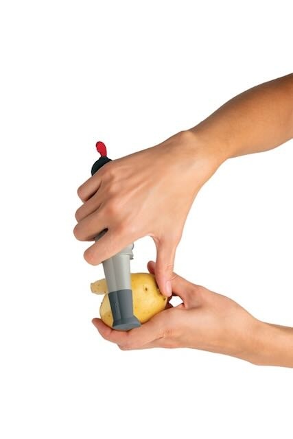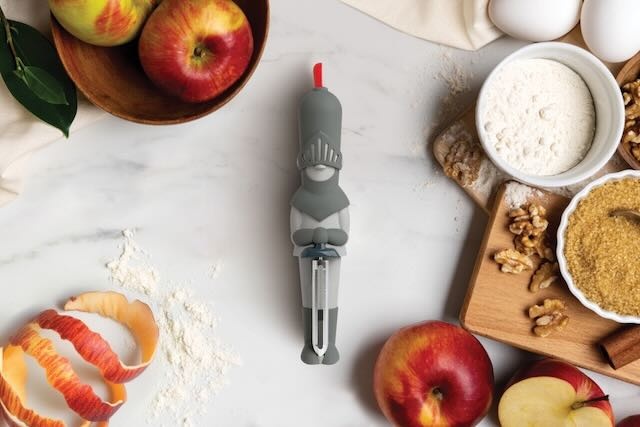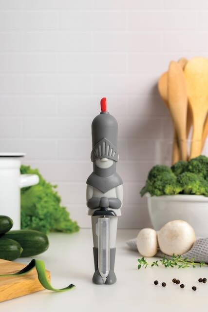 Sir Peels A-lot van Ototo is jouw trouwe keukenridder in harnas! Met zijn scherpe zwaard schilt hij moeiteloos al je groente en fruit, klaar om iedere culinaire strijd te winnen. Maar deze dappere held heeft meer in huis: op zijn helm prijkt een handige punt waarmee hij met gemak aardappels ontpit. Een vleugje middeleeuwse charme en een flinke dosis functionaliteit maken Sir Peels A-lot de ultieme keukengadet! Met de pluim op zijn muts kun je aardappels ontpitten. Er zit een hoesje bij voor over het scherpe deel. Afmetingen 20 x 4 x 4 cm.