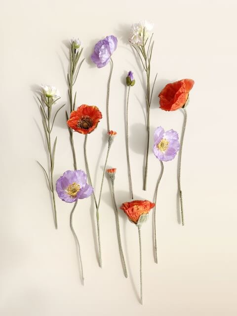 Lengte bloemen: 20–36 cm. Materiaal: kunstzijde, polyester (steeltjes) en ijzerdraad.
