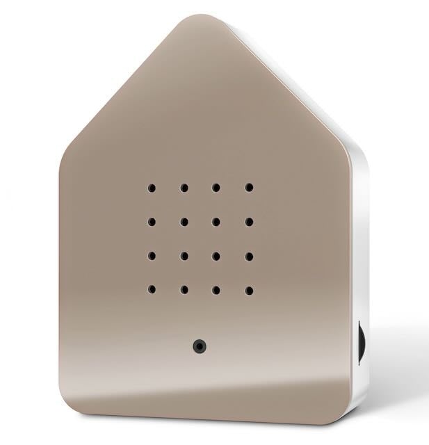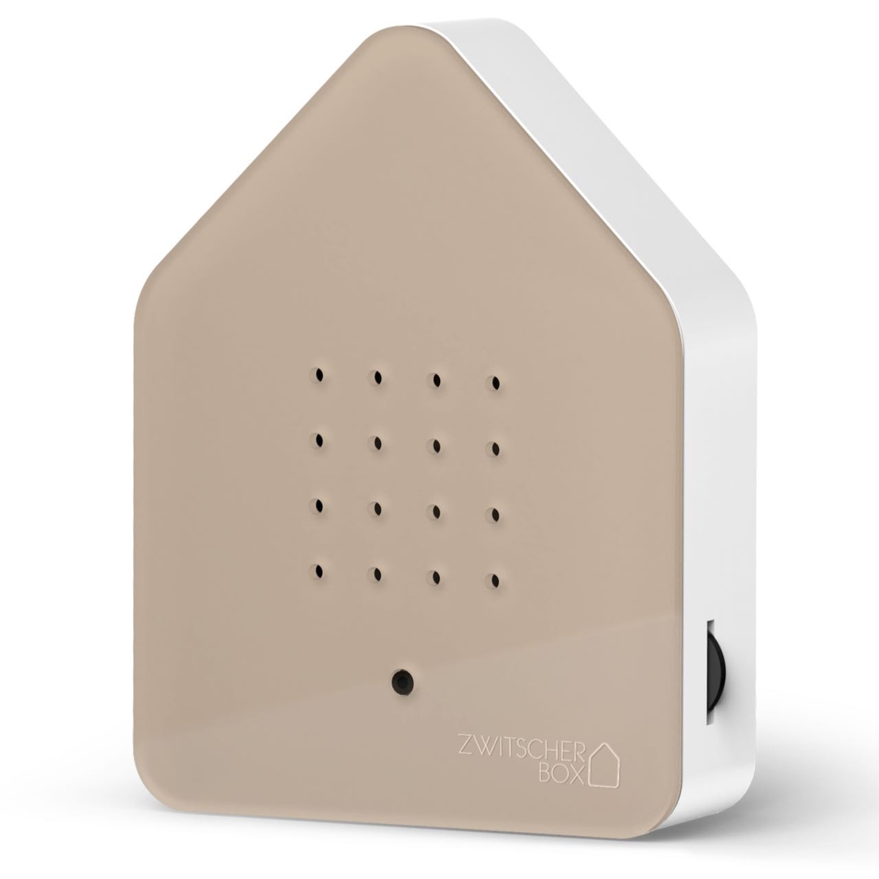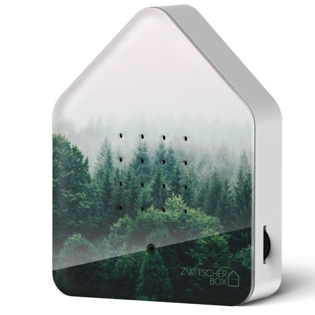 De Zwitscherbox is vormgegeven als een modern vogelhuisje met een minimalistisch karakter. De behuizing is van duurzaam kunststof met een elegante houten frontplaat bij de houten uitvoeringen.