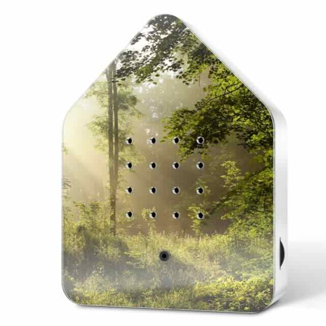 De Zwitscherbox is vormgegeven als een modern vogelhuisje met een minimalistisch karakter. De behuizing is van duurzaam kunststof met een elegante houten frontplaat bij de houten uitvoeringen.